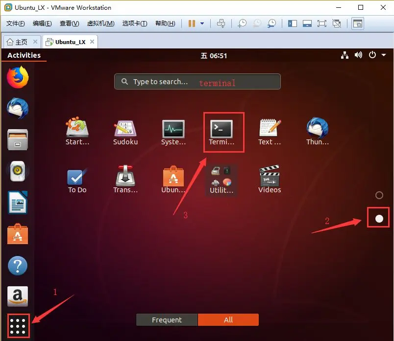 在对Ubuntu进行配置时,命令行窗口(Shell)是必须的,但Ubuntu默认未将这个命令行窗口放在左边任务栏里,因此我们要先把它调出来。