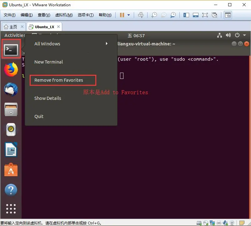 因为我们对命令行窗口非常常用,所以我们可以将它固定在任务栏里。在Ubuntu 18.04里,只需将终端的图标从任务栏下面拖拽到上面即可自动固定在任务栏里,其它版本的Ubuntu可能需要右击,然后选择 「Add to Favorites」。