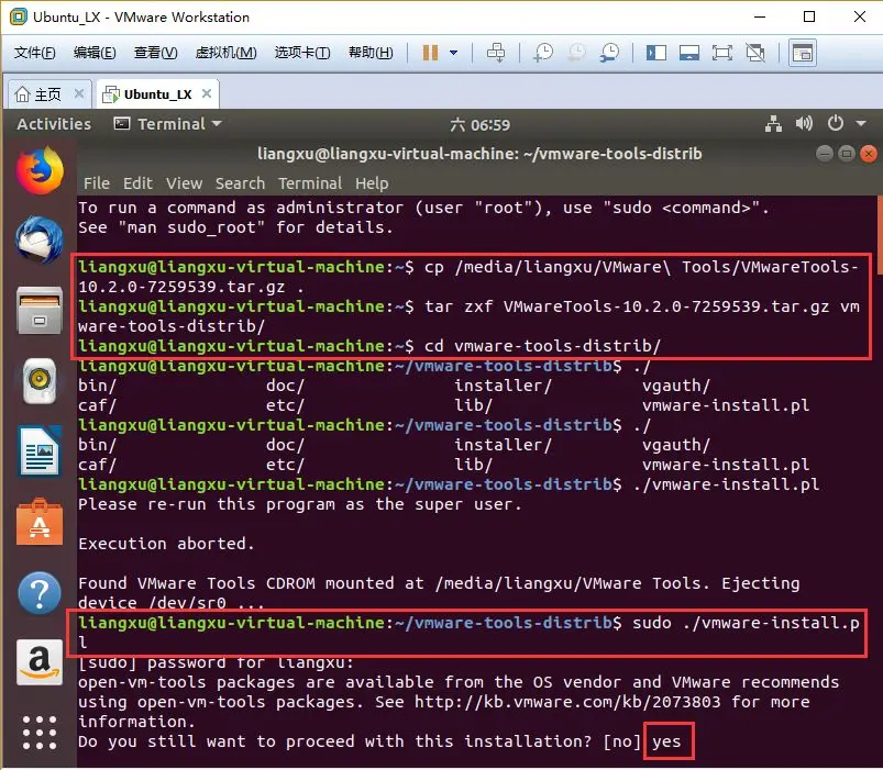 1.4 进到vmware-tools-distrib,安装VMware tools。安装过程第一次询问的时候,输入 「yes」 ,之后一路回车即可。