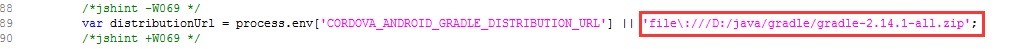 红色部分替换成你本地已经下载好的(或是从别人那儿拷贝过来的) gradle的zip包的本地路径 例如: file\:///D:/java/gradle/gradle-2.14.1-all.zip