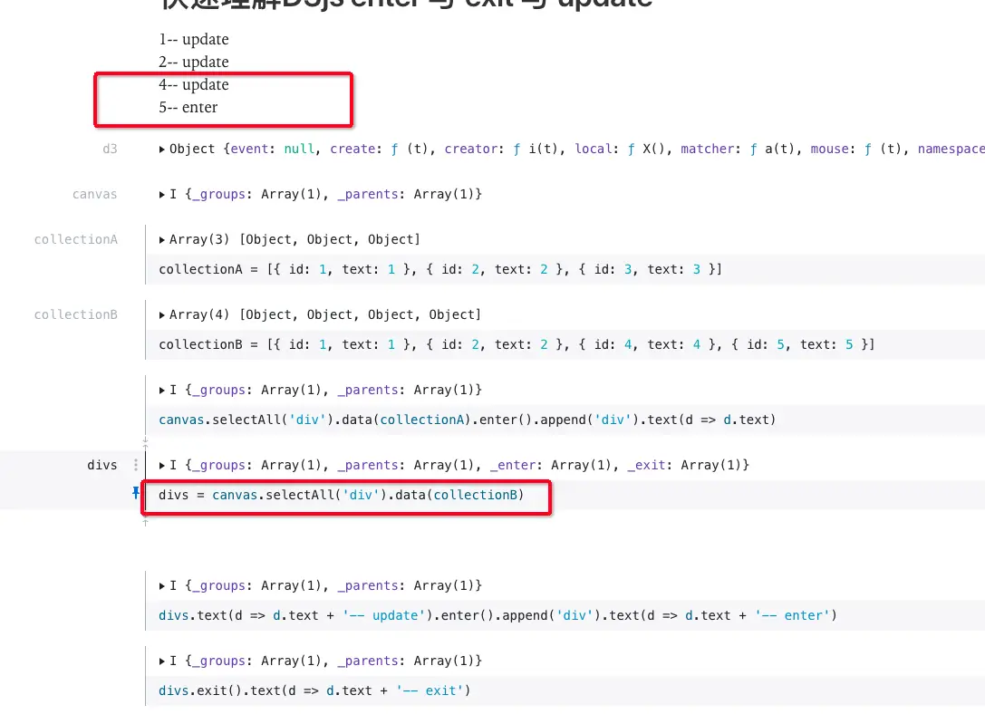 这张图,初学d3的同学都见过。可能解释的比较少的是中间的equalBy部分。collectionA 即指上一次绘制所棒定的数据,如果上次未绑定数据即[undefine, undefine ....],如果没有图形就是空数组[]。collectionB 是我们要刷新视图的新数据集合。