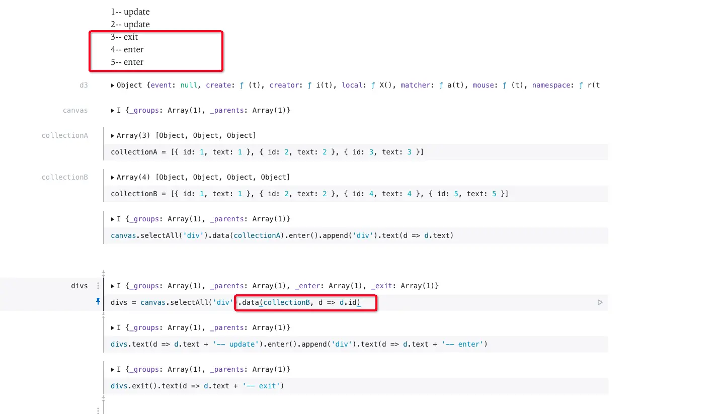 const equalBy = obj => obj.id; // 自定义设置规则 selection.data(data, equalBy)