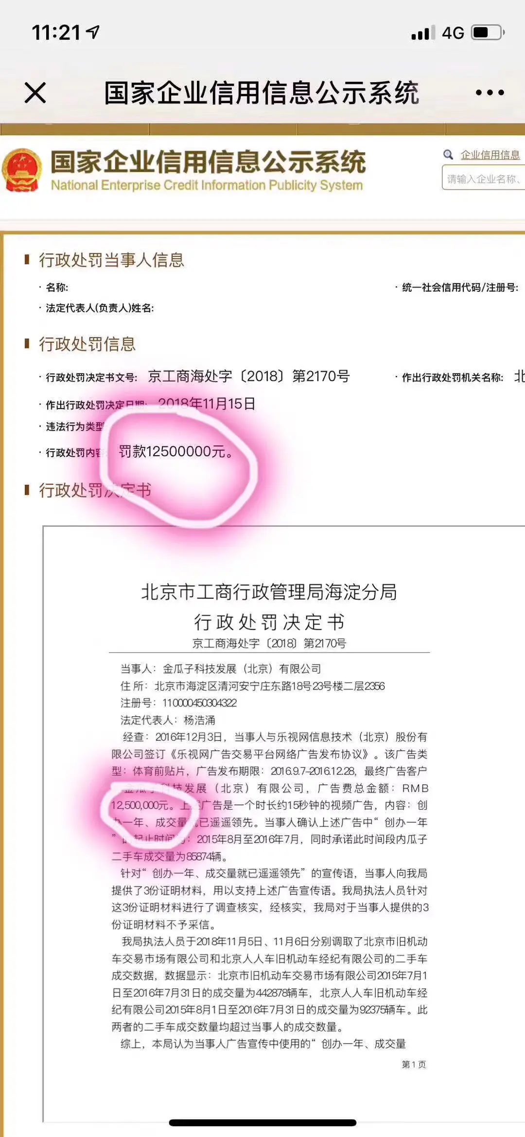 据国家企业信用信息公示系统显示,北京市工商行政管理局海淀分局于日前发布,对金瓜子科技发展(北京)有限公司行政处罚决定书,罚款共计1250万元。
