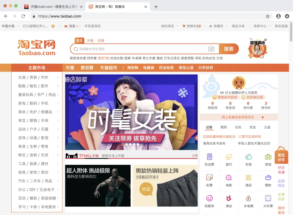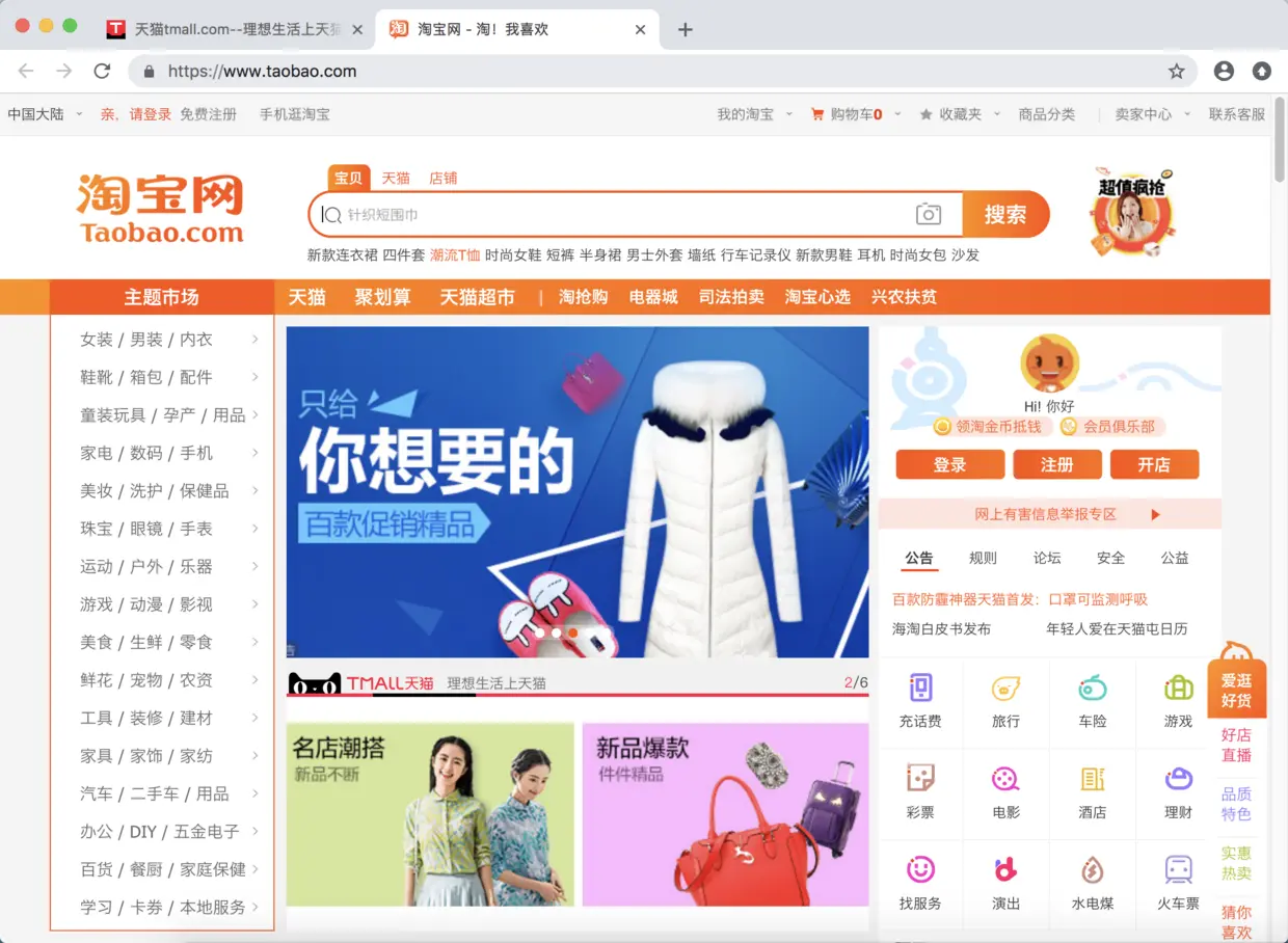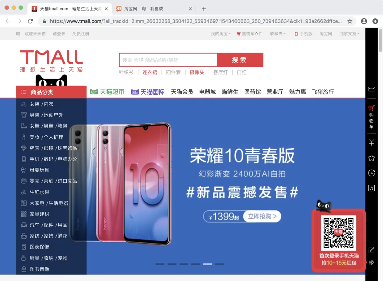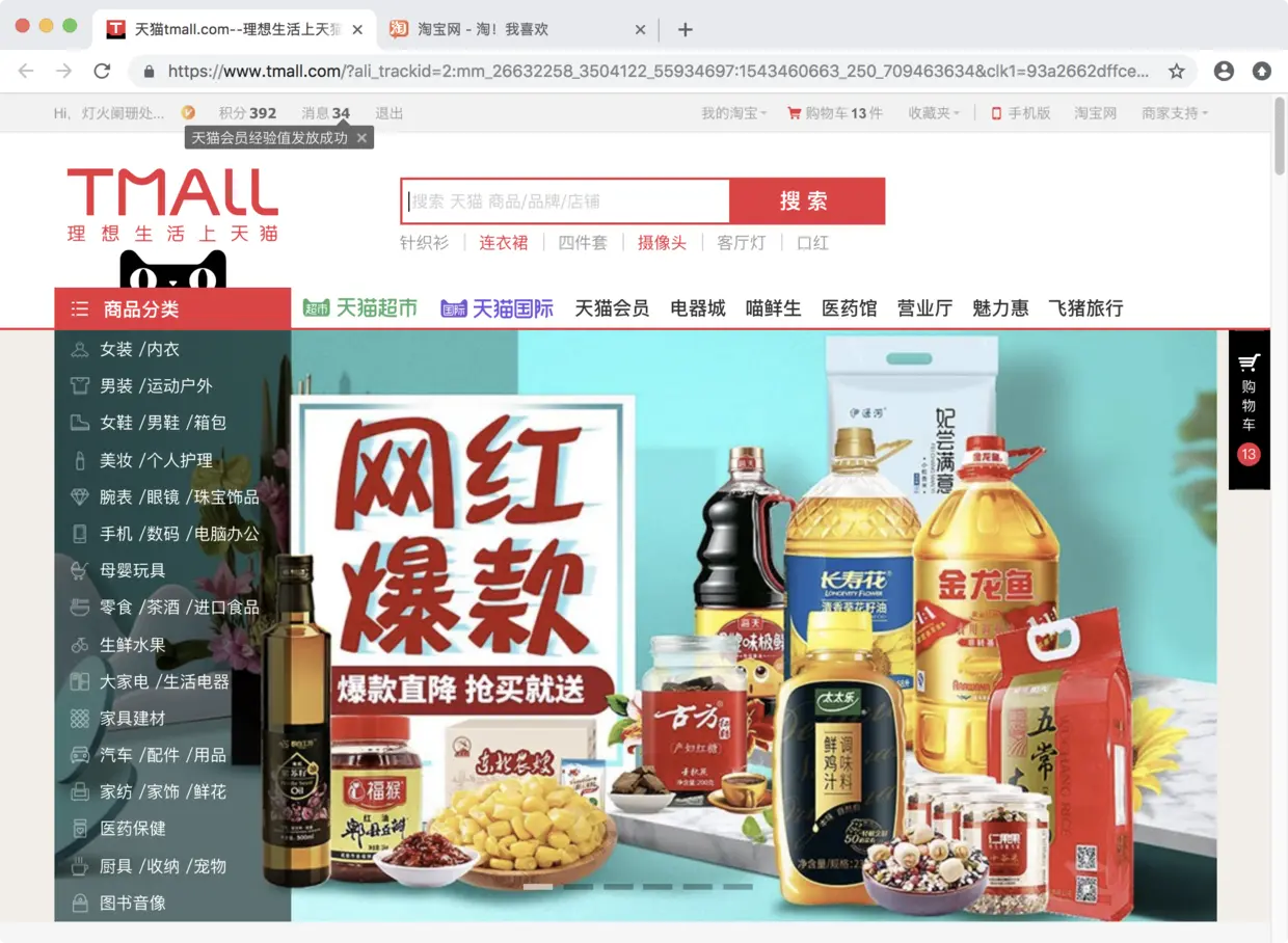 如图,我们两个网站都是没有登录的,现在我们登录淘宝,然后不登录天猫直接刷新。