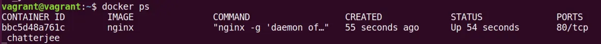 然后我们另外开一个终端,用docker ps命令查看这个运行起来的容器实例,Status的Up 54 seconds意思是从该实例启动到现在已经经过了54秒。