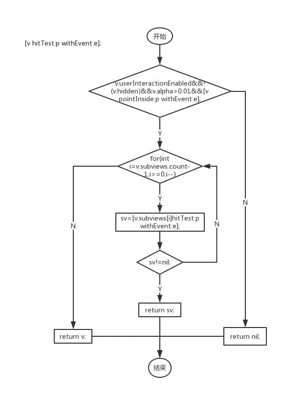 首先,先判断视图的用户交互是否打开、是否隐藏、透明度是否大于0.01,如果有一个不符合,那么该视图将不处理任何事件响应,也不会进行后续的操作了.如果这三个条件都满足了,就会调用当前视图的-(BOOL)pointInside:(CGPoint)point withEvent:(UIEvent *)event方法来判断点击的点是否在当前视图范围内,如果不在的话也会返回nil再由它当前视图的父视图去遍历它的同级兄弟视图,调用对应的-(UIView *)hitTest:(CGPoint)point withEvent:(UIEvent *)event方法.如果当前视图的-(BOOL)pointInside:(CGPoint)point withEvent:(UIEvent *)event返回YES,那么就会以倒叙的方式遍历当前视图的子视图,遍历的过程中会调用所有自视图的-(UIView *)hitTest:(CGPoint)point withEvent:(UIEvent *)event方法,如果某个子视图返回了最终的事件响应视图的话,就会把对应的视图作为最终的响应视图返回给调用方,如果返回的是nil的话就会继续遍历当前视图的下一个子视图.如果全部遍历完了之后都没有对应的子视图去响应事件的话,由于当前点击位置在当前视图范围内,就会把当前的视图作为响应视图返回给调用方.