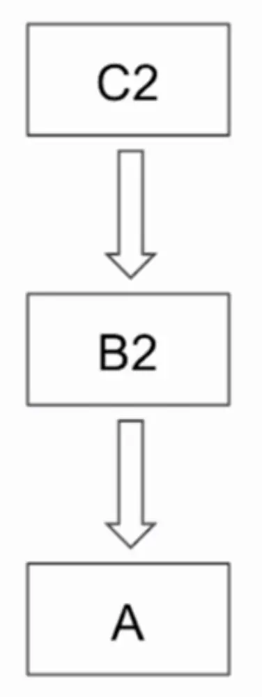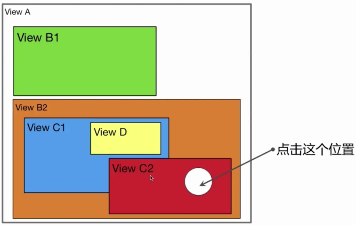 首先点击位置在C2、B2、和A区域内,那么这3个视图都是有可能响应事件的.如果C2是B2的子视图,B2是A的子视图的话,那么按照顺序应该先调用子视图的-(UIView *)hitTest:(CGPoint)point withEvent:(UIEvent *)event方法,而如果他们三个视图是平级的话,按照同级视图倒叙遍历的方式,也是C2先响应(因为C2覆盖在B2和A上).所以顺序就是C2先执行-(UIView *)hitTest:(CGPoint)point withEvent:(UIEvent *)event方法如果返回nil,B2再执行,最后才是A.如果都没有处理这个事件,那么最后会传到UIApplication,如果仍然没有处理这个事件,那么最后就会忽略这个事件.