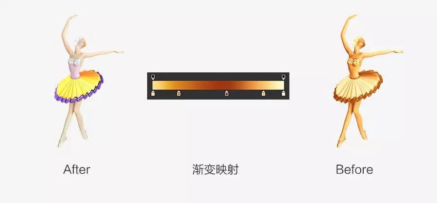 这次618使用了渐变映射,让画面产生了不错的效果。渐变映射,就是以亮度为标准,用渐变中的颜色替换图像中的颜色,这个技巧可以把找到的素材瞬间化腐朽为神奇,例如大家常常遇到需要把一个商品变成金色,只要在商品上叠加一个金色的渐变映射,就可以很轻松的改变原物体的色彩。