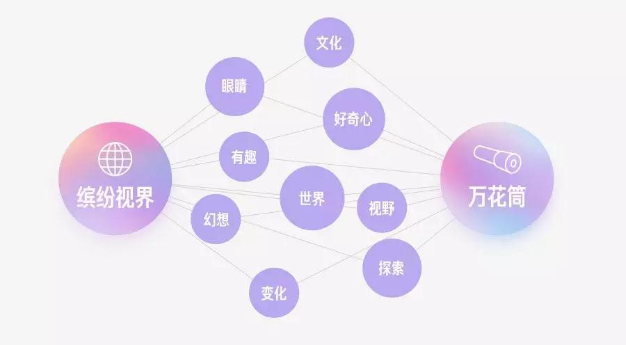 围绕此概念去发散灵感,我们发现一个能完美解读我们核心主题的视觉符号:万花筒!二者有很多属性上的共通,都是需要眼睛去看去感受,都希望能给用户一个奇妙新鲜的体验,都能调动用户的正面情绪,都有着相同的发现一个新世界的美好心情。