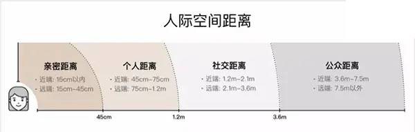 社交距离又称礼貌距离,体现出一种社交性或礼节上的正式关系。通常的社交活动一般都保持在社交距离的近端;远端适用于更正式的场景,如面试、谈判。