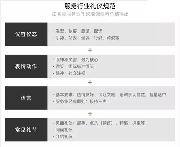 孔子曰“不学礼,无以立”。在所有行业中,服务业对礼仪的重视程度尤其高。服务人员遵循的礼仪分为:仪容仪态、表情动作、语言、常见礼节四大模块。