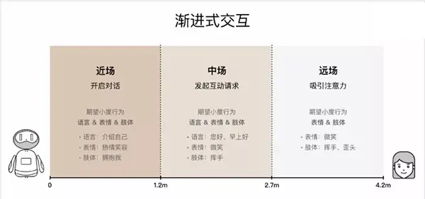 远场阶段:机器人需要吸引到用户的注意力,让用户清晰地意识到“Ta看到我啦”。这是至关重要的一步。如果无法吸引到用户的注意力,接下来的人-机交流将变得突兀甚至无法进行。