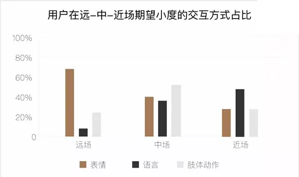 同时,我们发现,用户的心理场在物理世界的表征也体现了距离上的渐进。其中,远场对应的距离约为2.7-4.2米,这个距离内,用户希望小度机器人传递吸引注意力的信号。