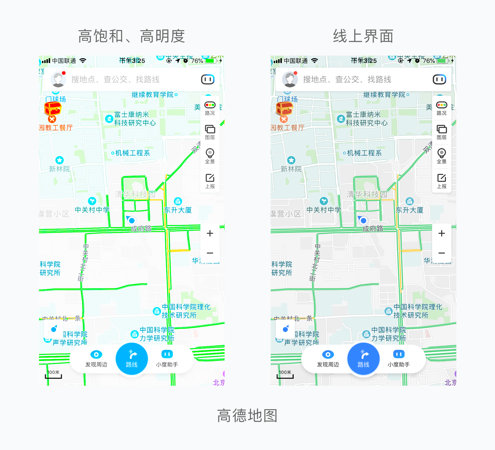 在实际的应用中,如果色彩饱和度过高,会对用户造成视觉疲劳,导致用户地产品的忍耐度直线下降,我们以高德地图为例,左侧是通过软件处理后的高饱和、高明度的界面,右侧是线上界面。