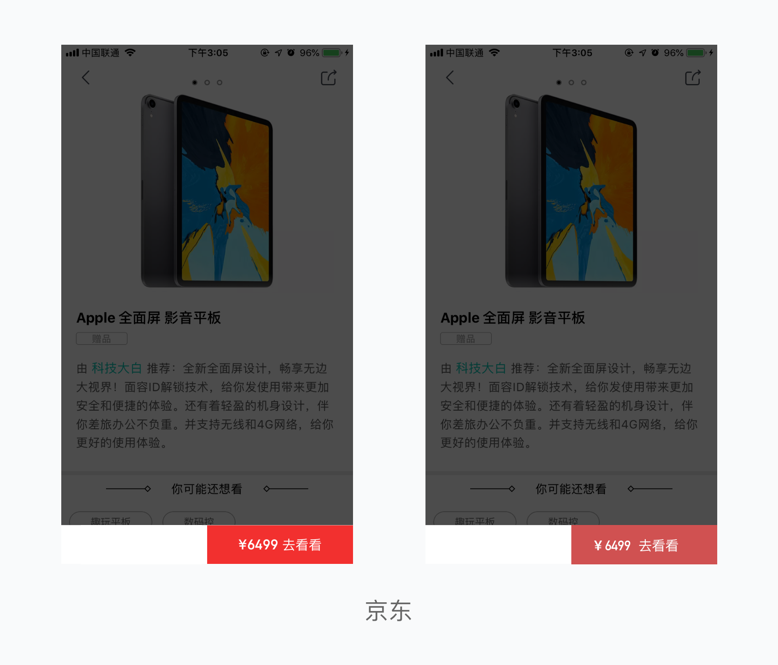 高明度和高饱和度的色彩更加容易吸引人的注意力,在唤醒度方面更加能够刺激用户的兴奋度,所以一般情况我们将明度和饱和度较高的颜色用于按钮的设计。例如京东: