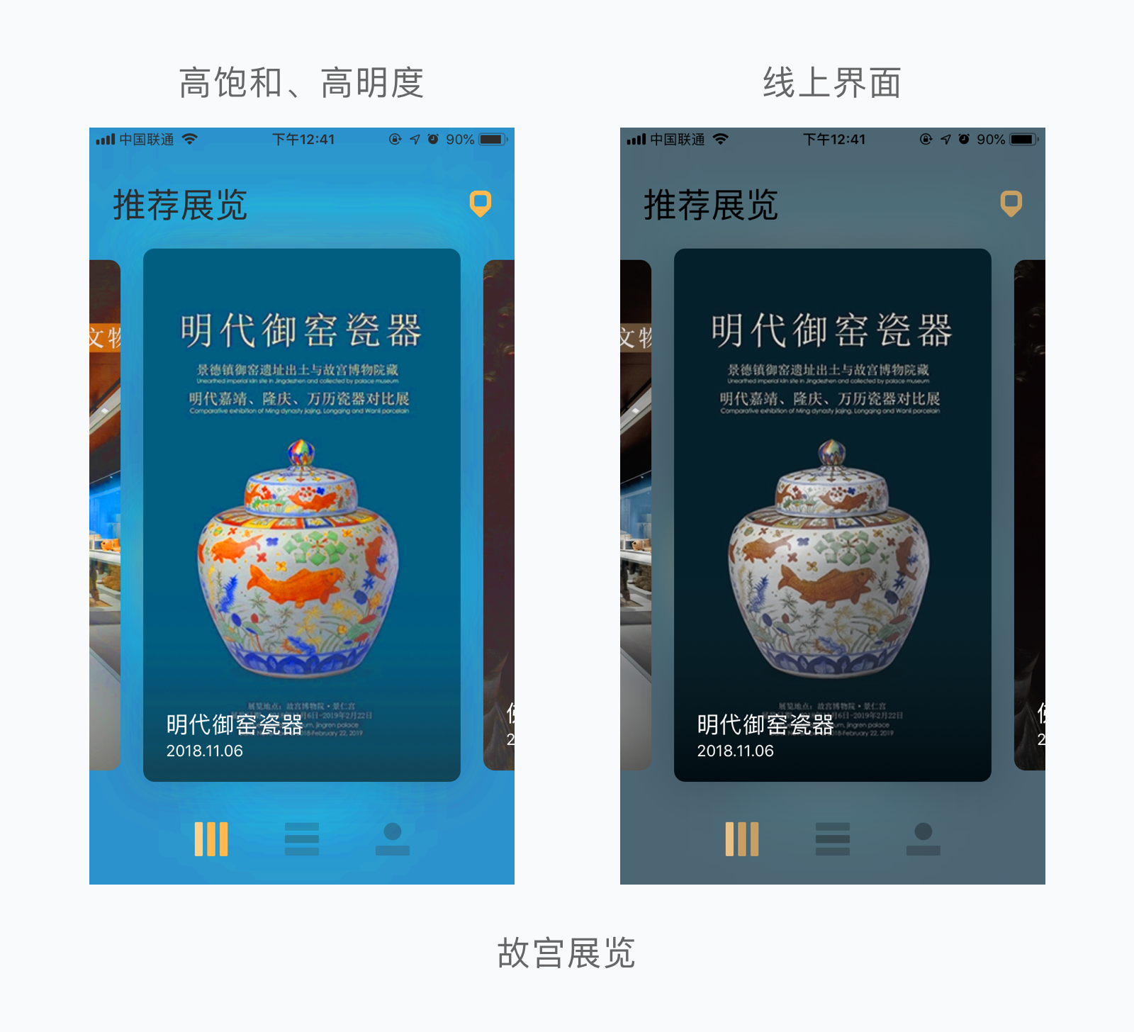 我们以故宫展览为例,对其进行饱和度和明度的调试再与原界面进行对比: