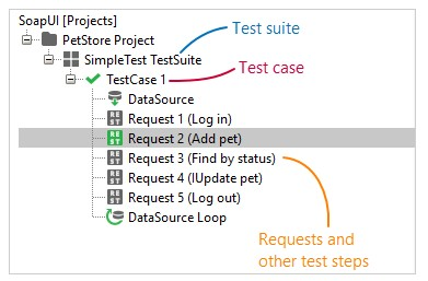 在现实生活中,客户端通常向服务器发送一系列请求。例如,对于在线商店,第一个请求可用于登录,以及后续请求,比如用于购买某些产品。在SoapUI中,用户通过将请求和其他测试步骤组织到测试用例中来模拟这种真实行为。一起工作的多个测试用例被分组到测试套件中,而测试套件又属于测试项目。