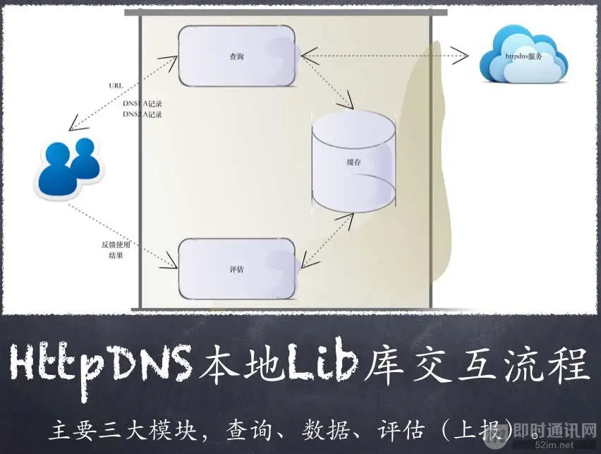 从上图中可以看出来 整个业务的交互流程,用户向查询模块传入一个URL地址,然后查询模块会检查缓存是否存在,不存在从httpdnsapi接口查询, 然后经过评估模块返回。在用户请求URL过程完毕时,需要将这次请求的结果反馈给 lib库的评估模块由评估模块入库记录本次质量数据。