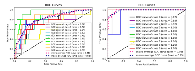多项逻辑回归模型应用于10个类的子集。单个字母的AUC-ROC对于notMNIST约为0.92,对于CGCL约为0.60(参见下图)。非MNIST和CGCL的平均AUC值分别为0.99和0.82。2D-CNN在CGCL上显示出0.94的准确度,在非MNIST上显示为0.91。