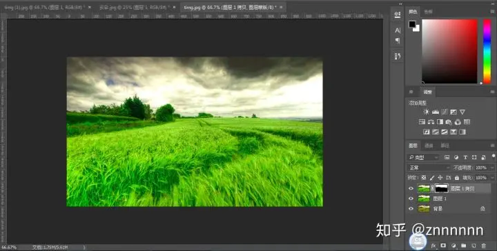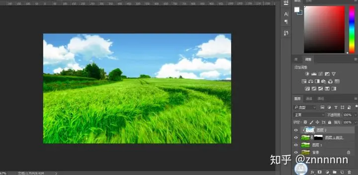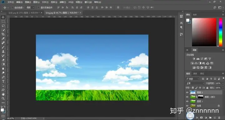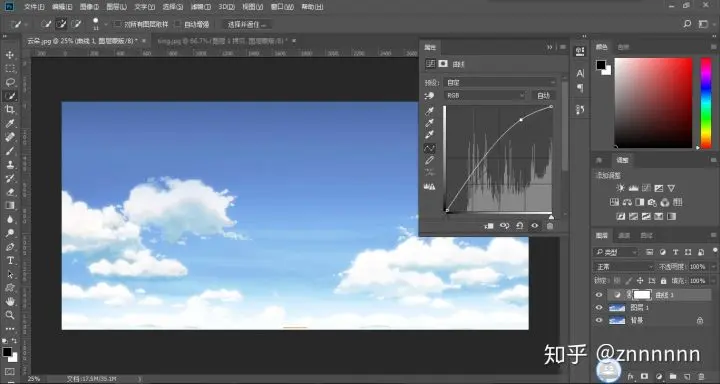 接着,按住alt把鼠标移到第一个图层和第二个图层的中间,出现一个箭头后点击一下,对天空稍作调整