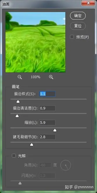 现在有那么一点感觉了,进行下一步调整。打开:滤镜→风格画→油画,参数是不一定的,可以根据个人的喜好