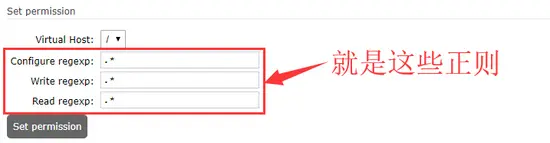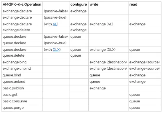 configure:主要对应创建exchange和queue操作; write:write主要对应绑定和推送消息操作; read:read主要对应读取消息操作。 后面有个表格列出了具体的对应关系。