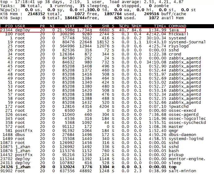 1、上图中可以看出pid为23344的java进程占用了较多的cpu资源;