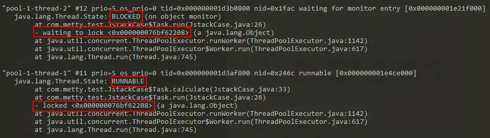 在top命令中,已经获取到了占用cpu资源较高的线程pid,将该pid转成16进制的值,在thread dump中每个线程都有一个nid,找到对应的nid即可;隔段时间再执行一次stack命令获取thread dump,区分两份dump是否有差别,在nid=0x246c的线程调用栈中,发现该线程一直在执行JstackCase类第33行的calculate方法,得到这个信息,就可以检查对应的代码是否有问题。