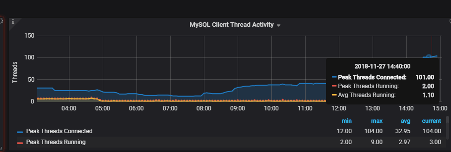 登录 Grafana 监控面板,数据库连接在哪个时间段曾有幅度的增长。