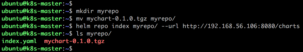 chart 通过测试后可以将其添加到仓库,团队其他成员就能够使用。任何 HTTP Server 都可以用作 chart 仓库,下面演示在 k8s-node1 192.168.56.106 上搭建仓库。