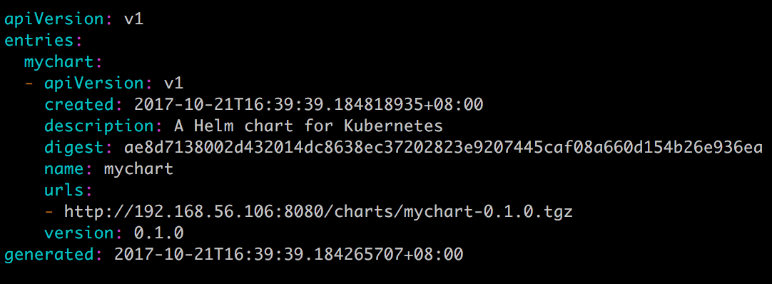 Helm 会扫描myrepo目录中的所有 tgz 包并生成index.yaml。--url指定的是新仓库的访问路径。新生成的index.yaml记录了当前仓库中所有 chart 的信息: