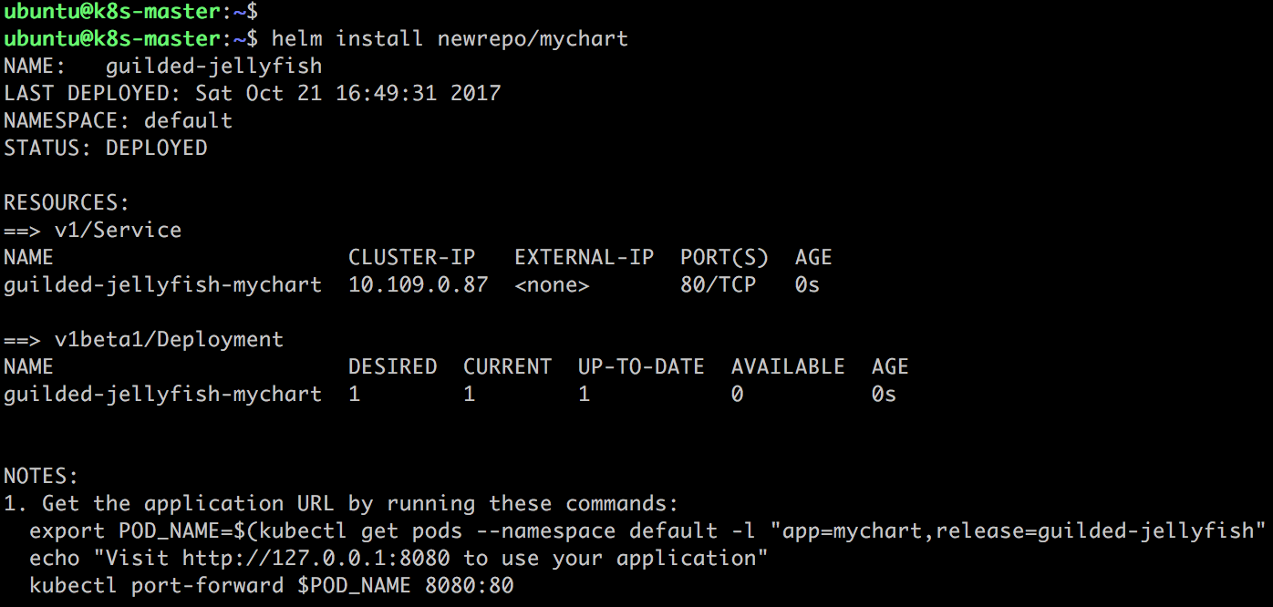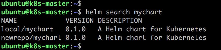 除了newrepo/mychart,这里还有一个local/mychart。这是因为在执行第 2 步打包操作的同时,mychart也被同步到了 local 的仓库。 -