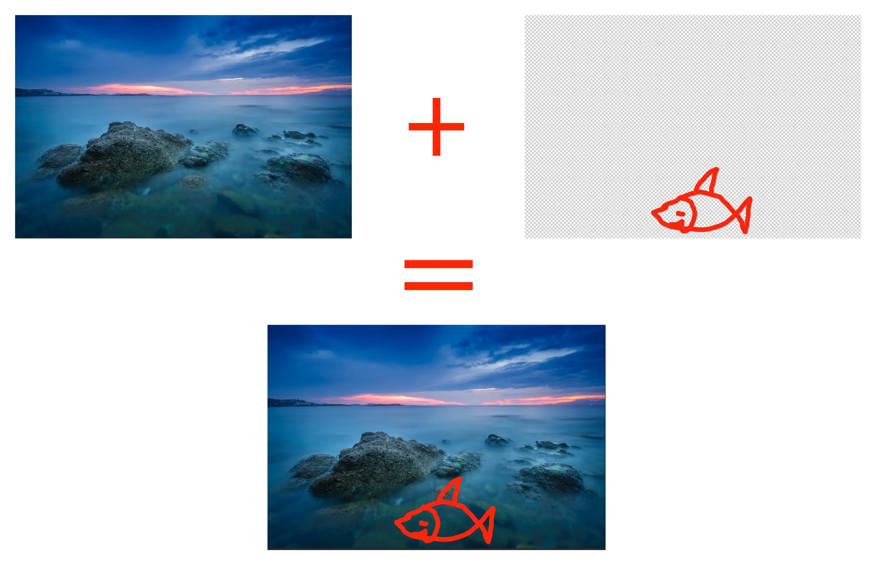 比如我们要在海景背景上画一条鱼,如果直接画在背景图层上,鱼的像素就直接覆盖掉了所在的背景图层上的像素。之后如果我想去掉这条鱼,或者对鱼单独进行编辑就不可能了。