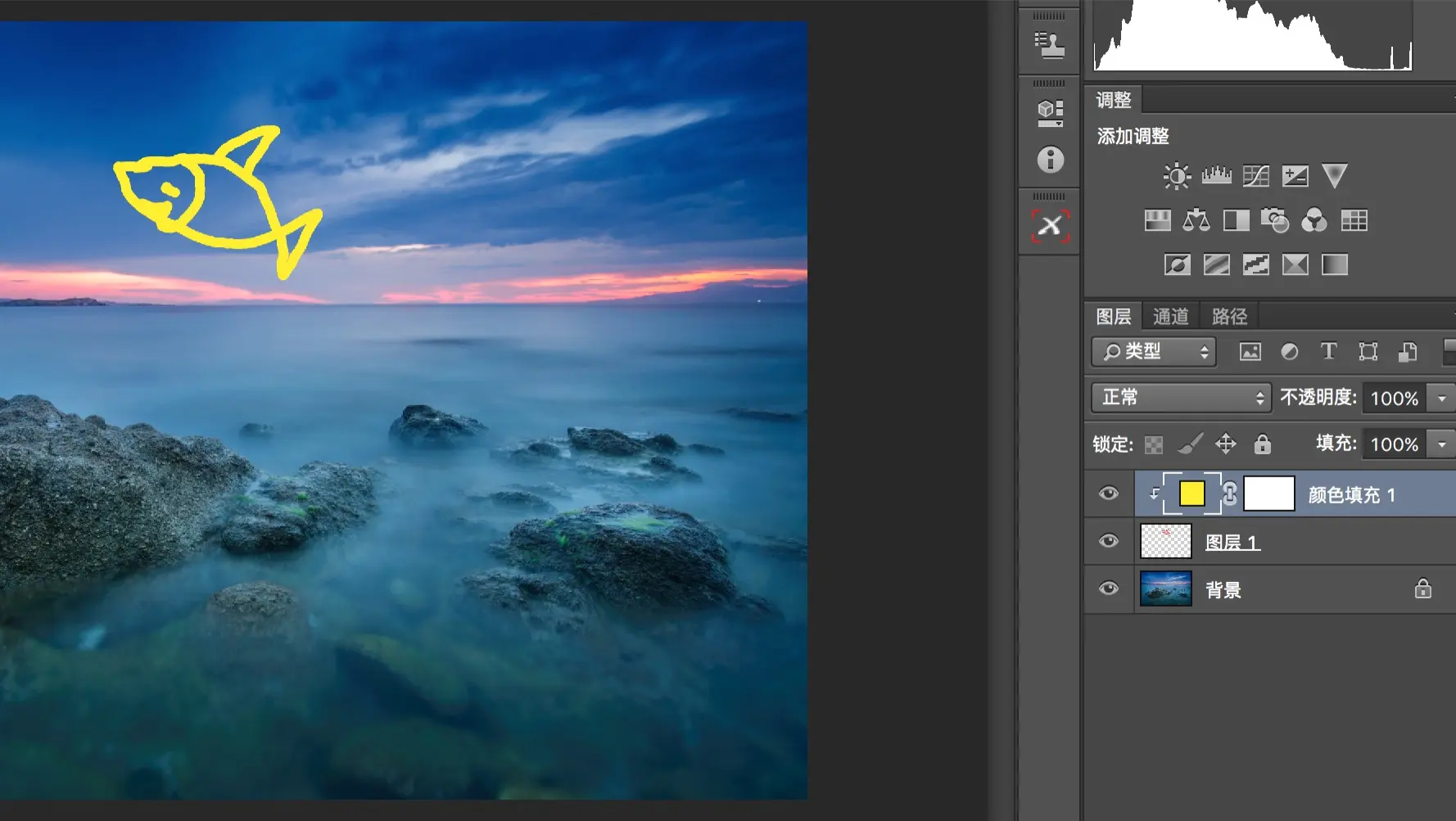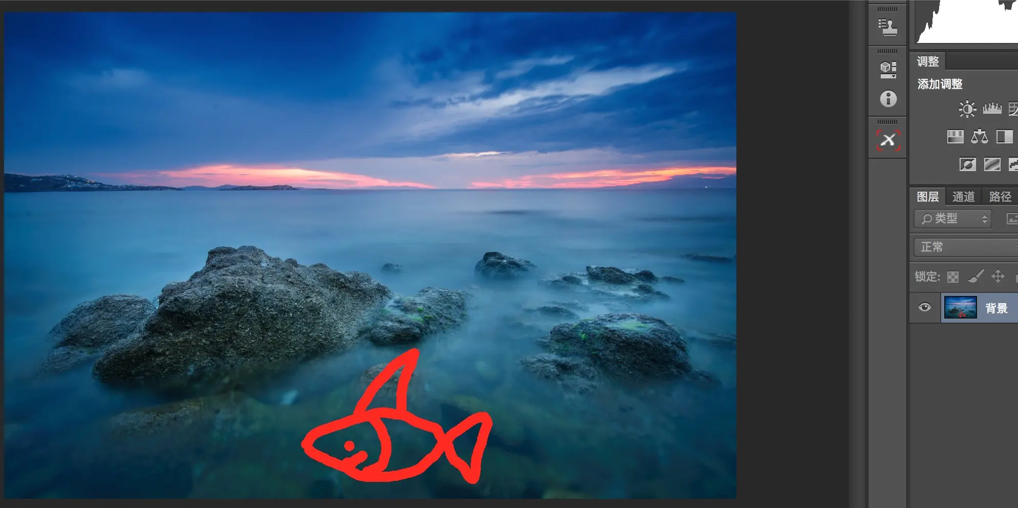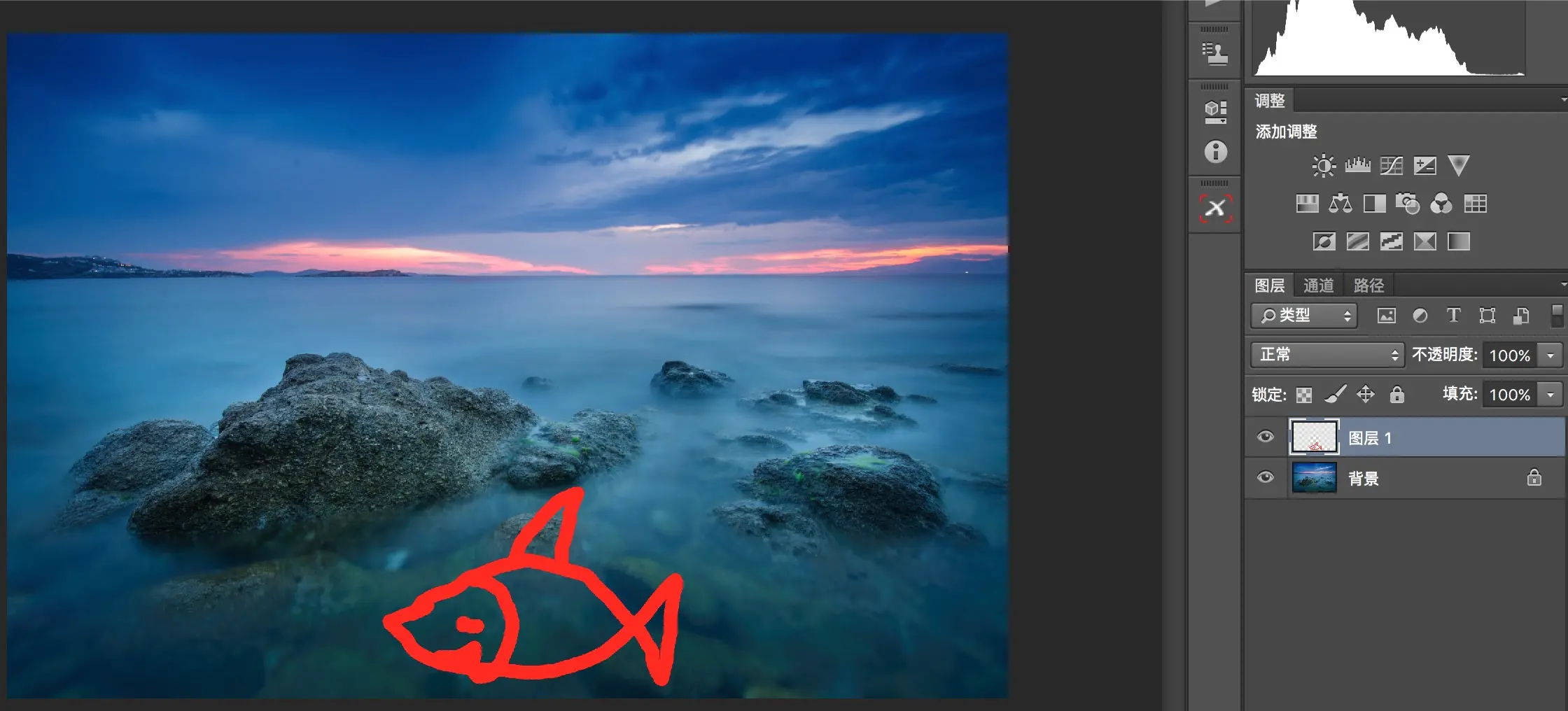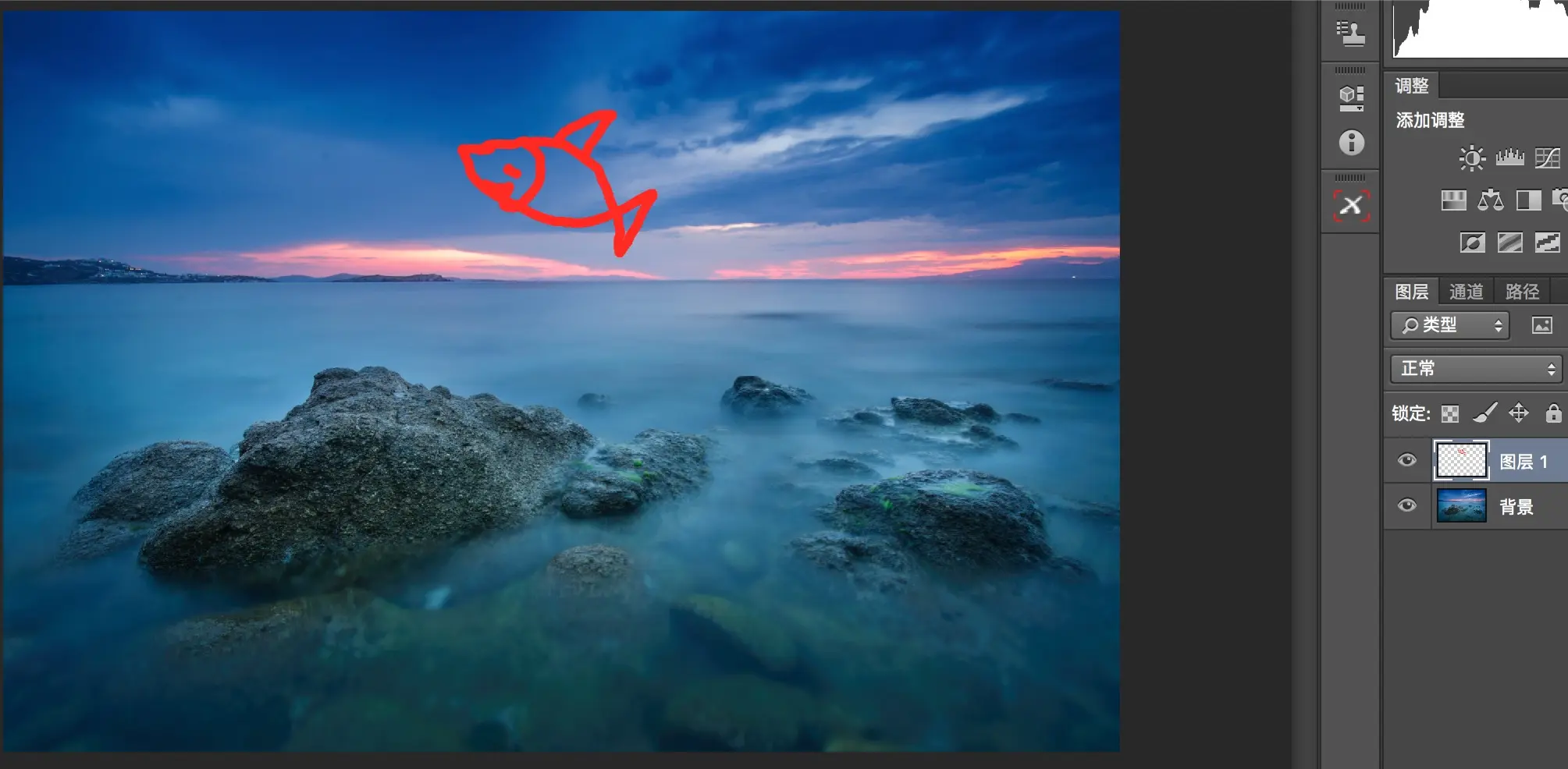 然后在新的图层上画这条鱼。由于鱼画在了新的图层上,原来背景图层的像素并没有被破坏,我们之后可以对两个图层分别进行调整而不影响到另外的图层。