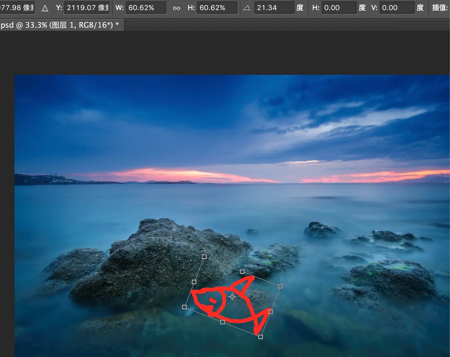 我也可以Ctrl+T对鱼图层进行单独的拉伸、放大、旋转等变形,而底下的背景丝毫不受影响。