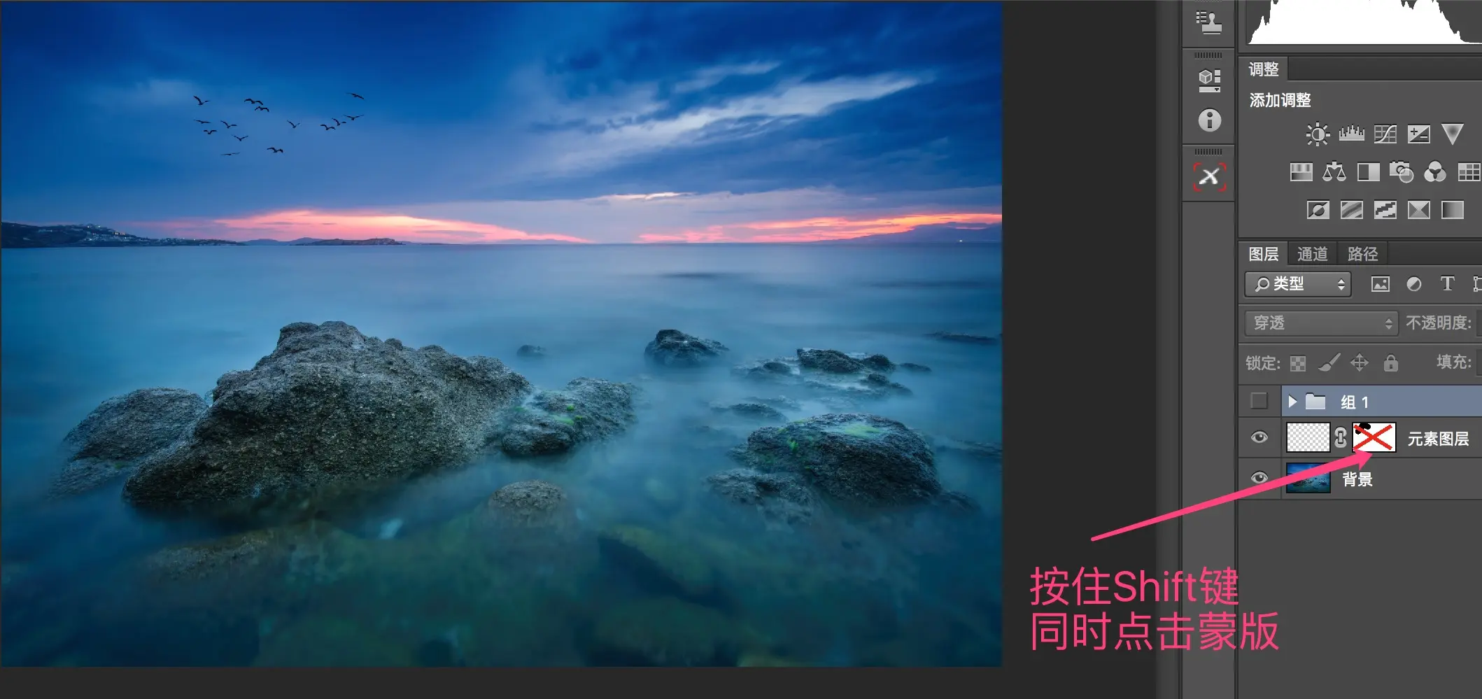 按住Shift键,同时点击蒙板,可以隐藏该蒙板,这样所有鸟又回来了。(再次Shift+点击又可以重新应用蒙板)