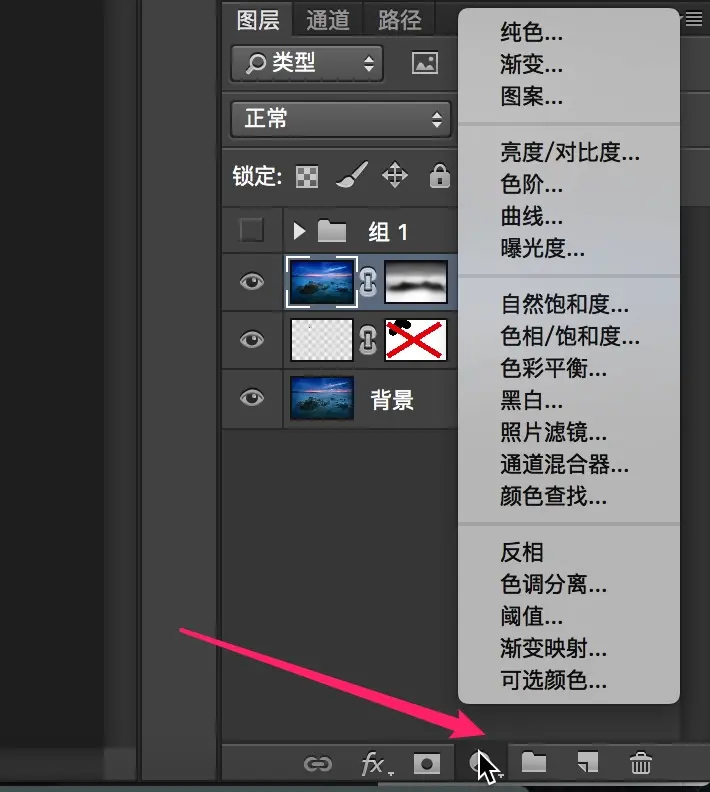 在图层面板下面的第四个图标,点击就可以打开调整图层面板。这里新建的自然饱和度、曝光度等等都会以新的调整图层形式存在。之后如果我们对效果不满意,只需要重新调整这些调整图层就可以了。更重要的是,我们可以用蒙板结合调整图层,把调整效果局限在某一区域。