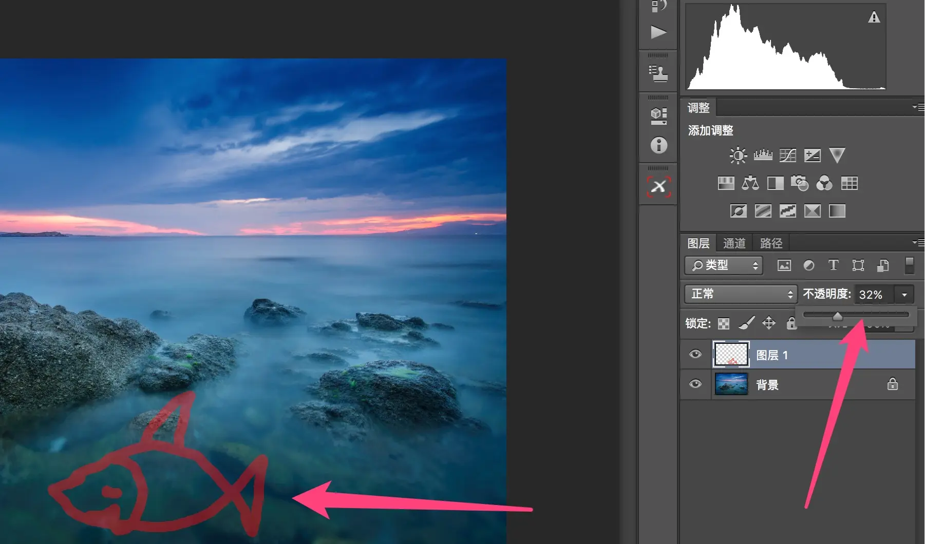 比如我可以在图层面板中选择鱼的图层,改变不透明度到32%。这样鱼就成了半透明的状态,红色轮廓上可以直接看到后面的海景。