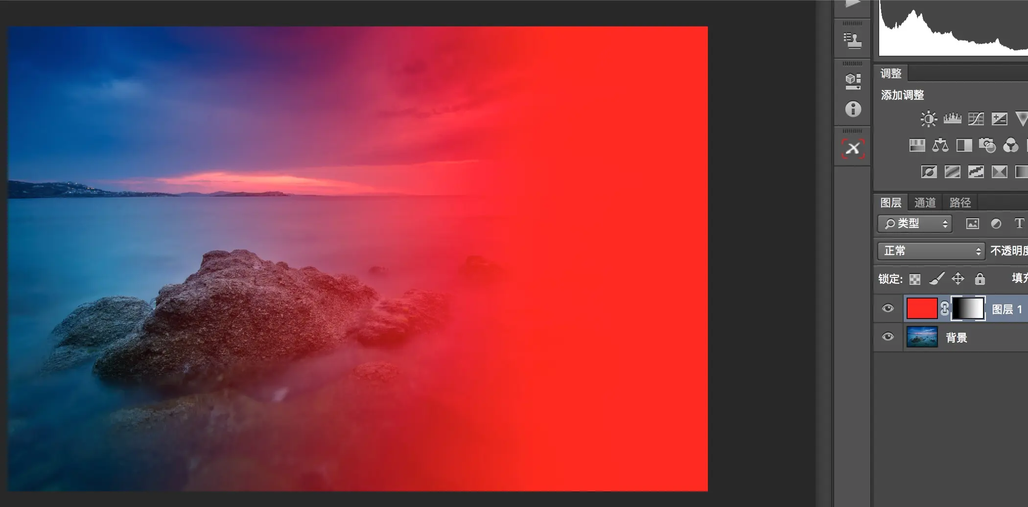 按住Alt键,同时鼠标单击蒙板,重新回到图层预览状态。可以看到黑色蒙板作用的区域,当前纯红图层完全是透明的,下面的风景显露了出来。右边蒙板白色作用的区域,红色图层完全不透明。中间灰色蒙板作用区域则是半透明的状态。