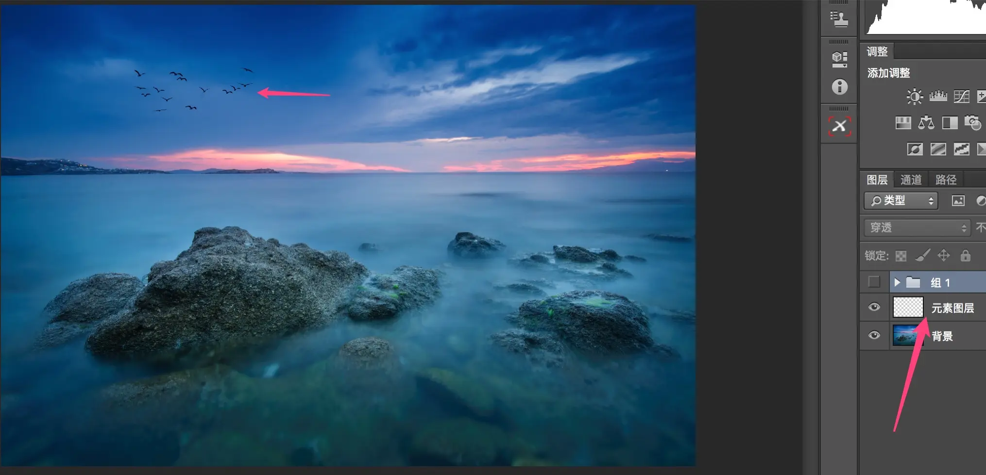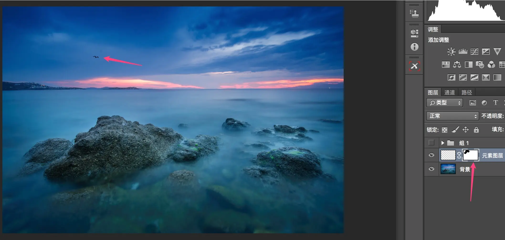 我直接用鼠标拖拽图片到PS中,飞鸟就以新图层的形式显示在了照片中,对飞鸟图层单独变型、移动、并添加一点冷色(Camera Raw滤镜减色温),飞鸟就较好的和背景融合在了一起。