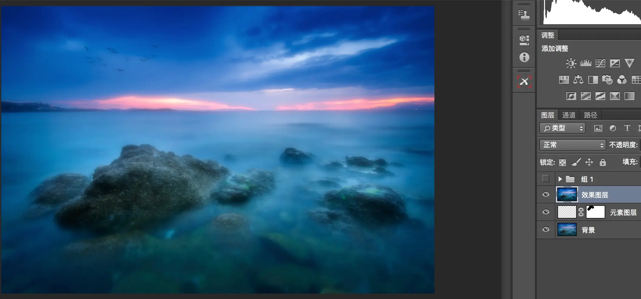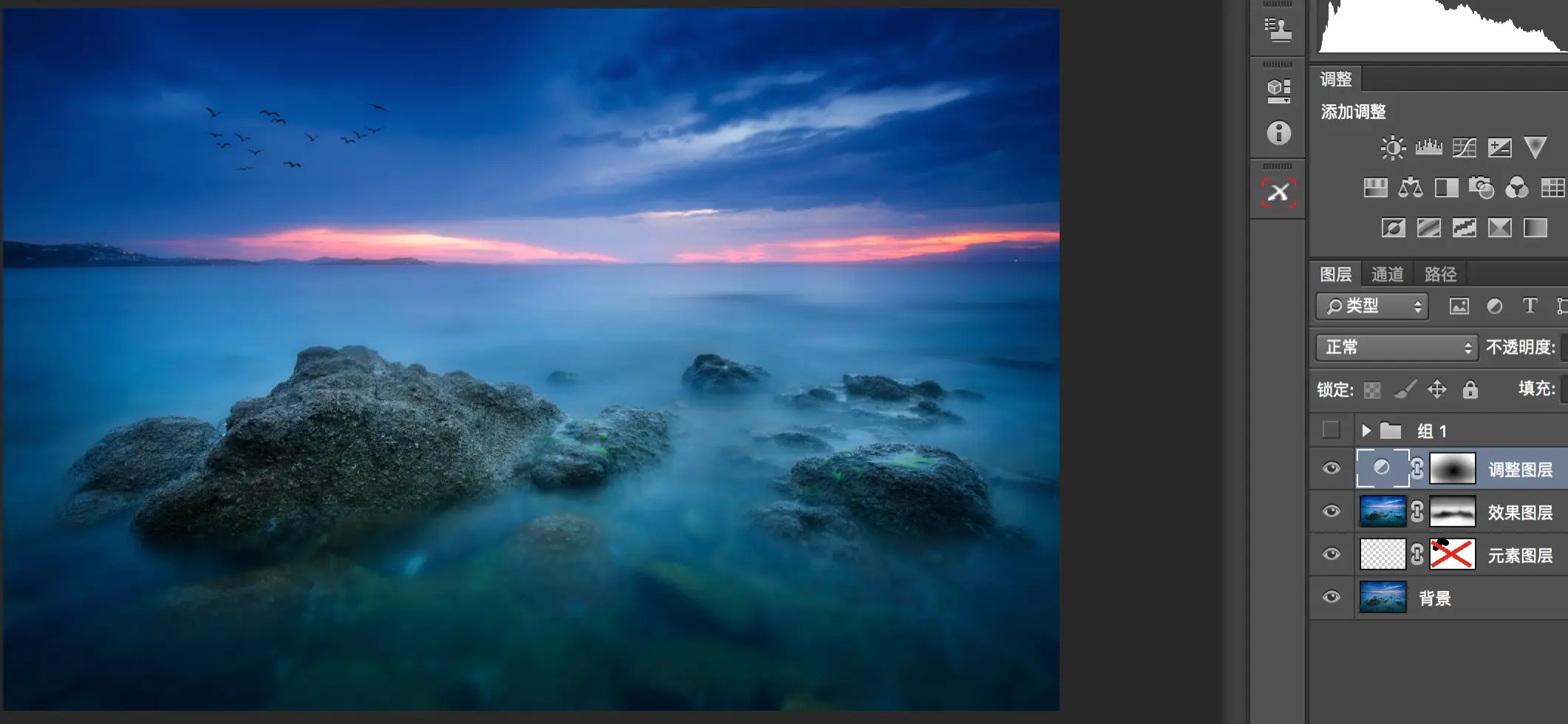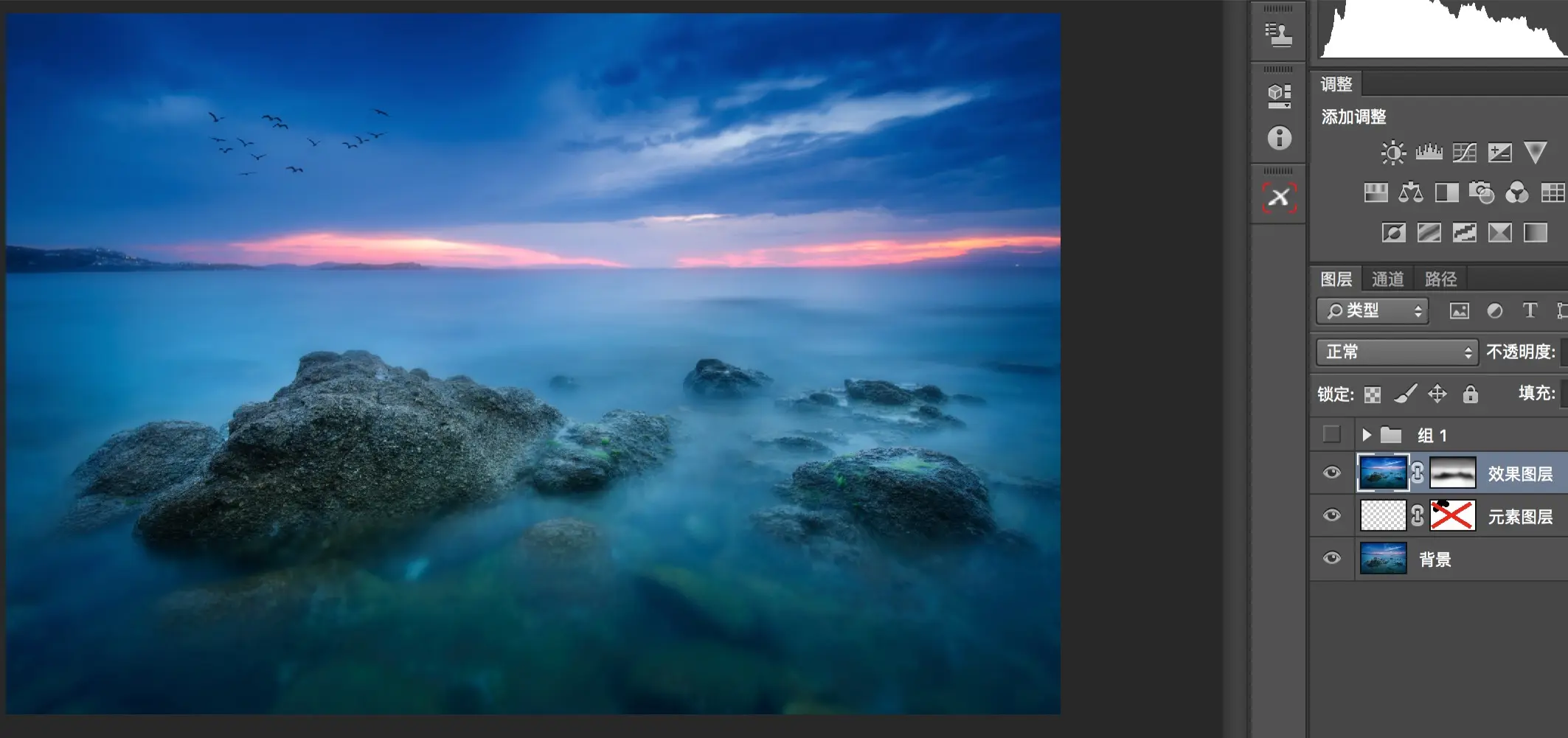 这样原来的海景照片,经过元素图层添加飞鸟,效果图层增加海水柔化程度,以及调整图层用曲线压暗四周,更加的有意境了。