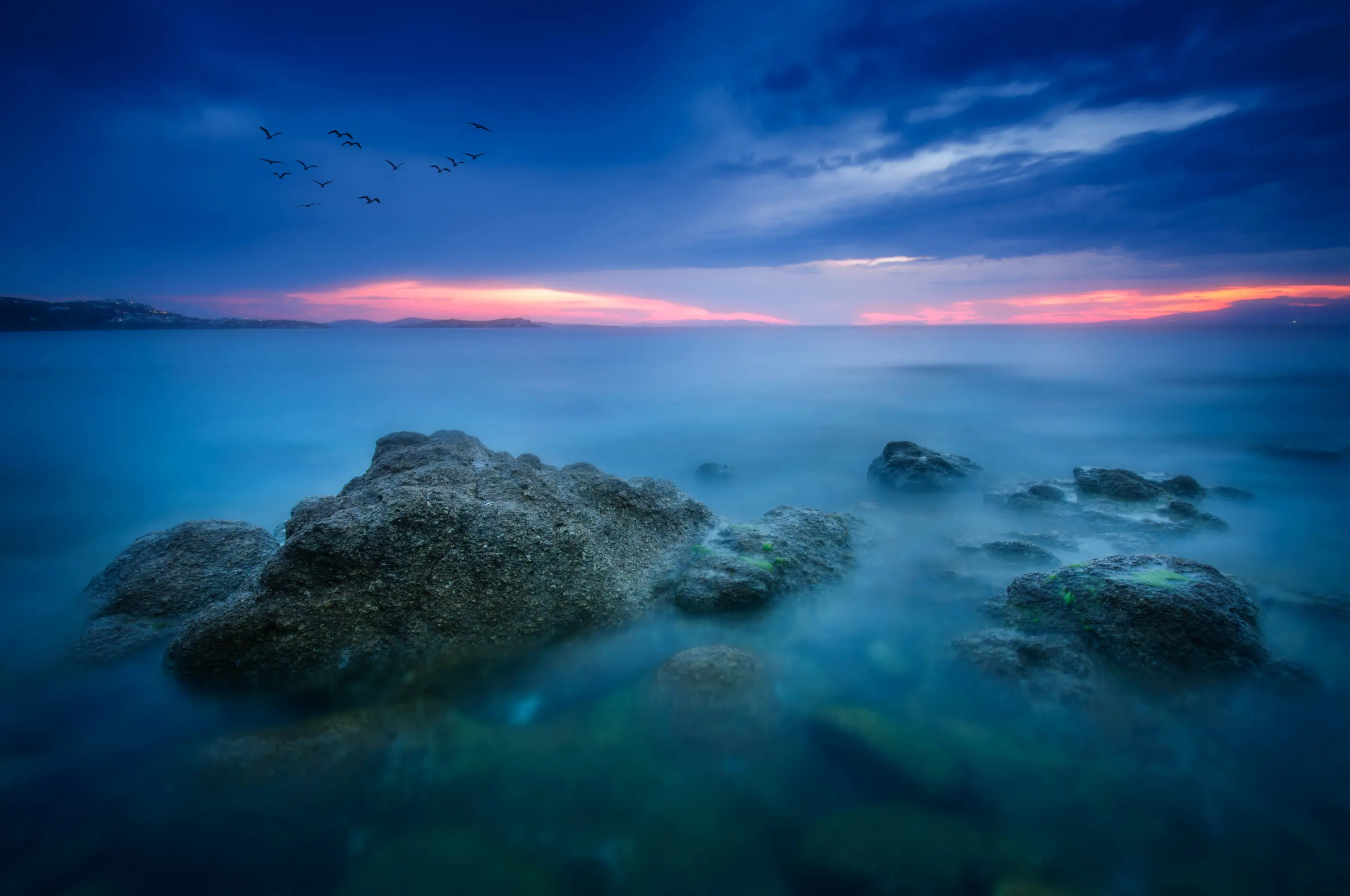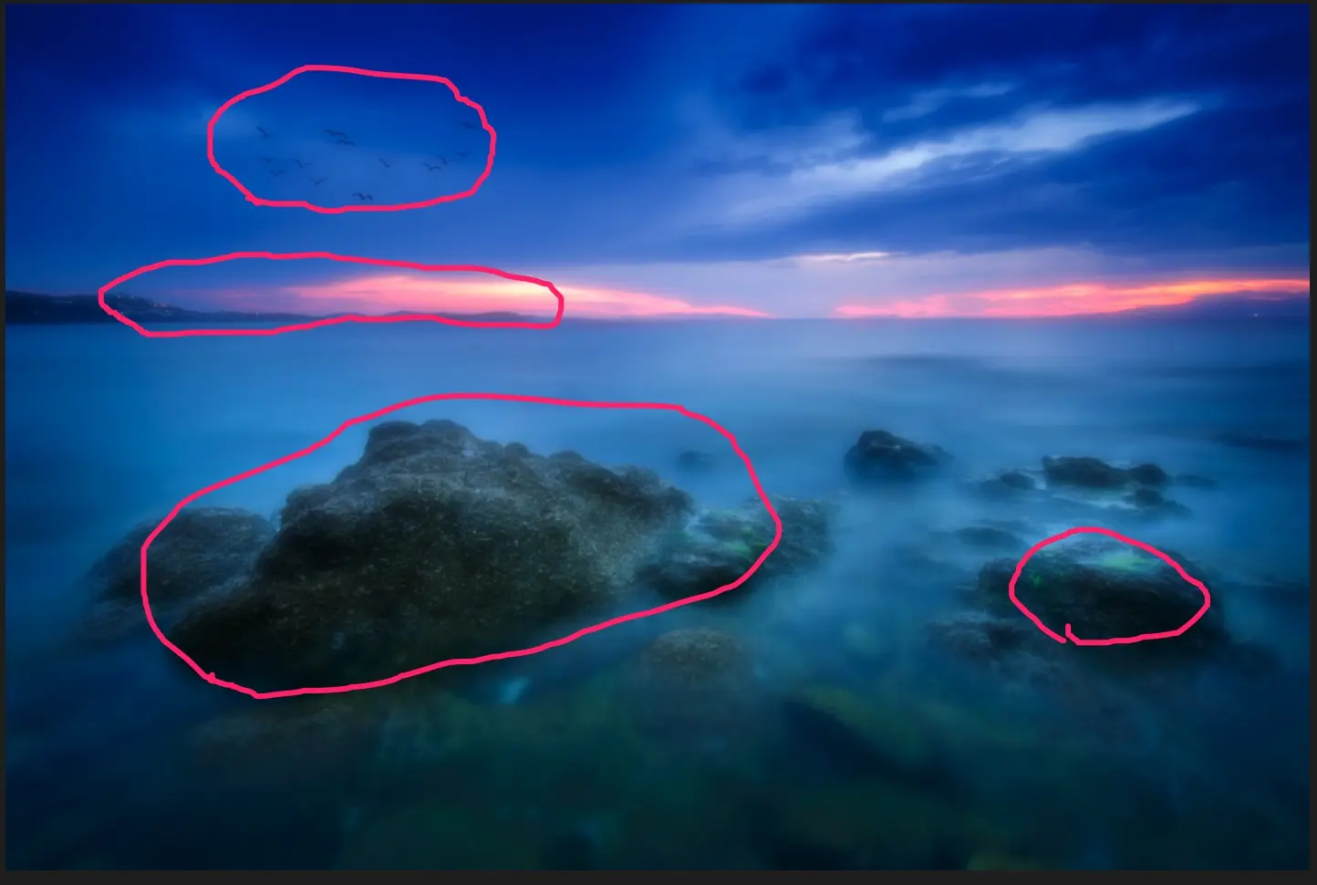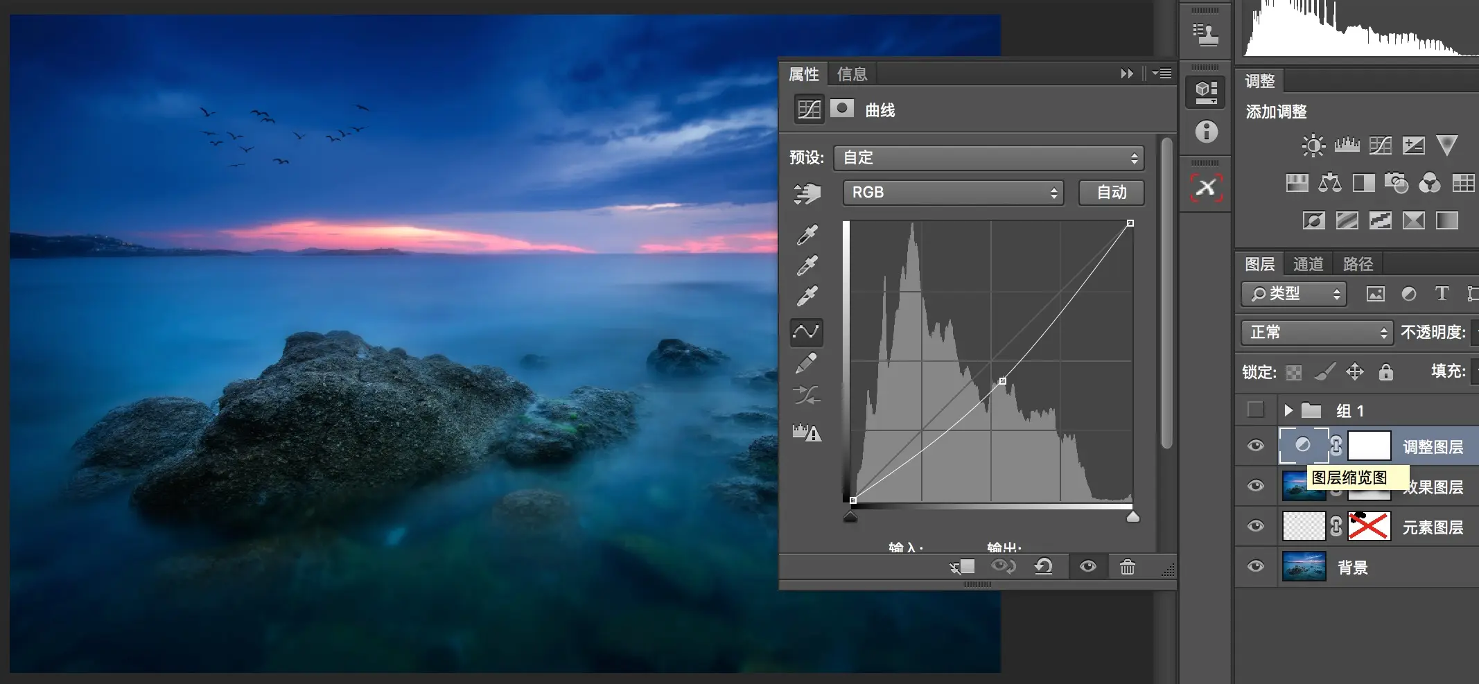 这样原来的海景照片,经过元素图层添加飞鸟,效果图层增加海水柔化程度,以及调整图层用曲线压暗四周,更加的有意境了。