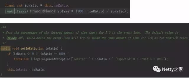 开了这个口子之后,就会存在风险,例如用户为了简化线程处理模型,把所有的业务任务封装成Task,丢到Nett用的I/O线程NioEventLoop中执行。为了防止过多的业务任务阻塞I/O线程的网络读写操作,NioEventLoop提供了设置I/O任务和非I/O任务的处理比例,通过合理的调整处理比例,来保证更合理的资源调度。
