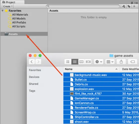 在文件系统中,从示例文件集合导航到game assets文件夹,选择该文件夹中的所有文件,然后将它们拖到Unity中Project window中的Assets文件夹中:
