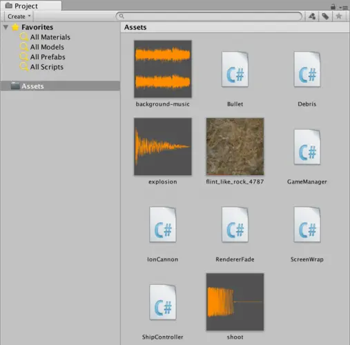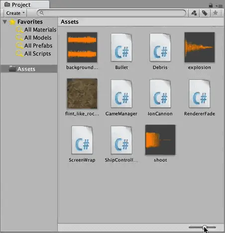 现在,是时候组织起来了! 选择Bullet,Debris,GameManager,IonCannon,RendererFade,ScreenWrap和ShipController脚本,然后将它们拖到Script文件夹中。