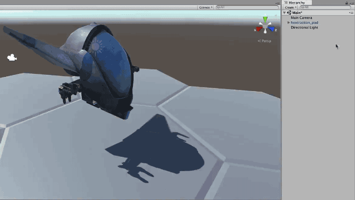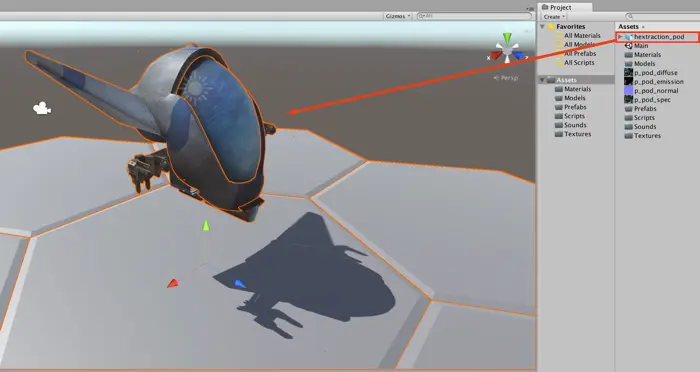导入player文件后,将hextraction_pod资源从Project window拖到Scene view中,如下所示: