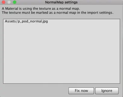 但是,Unity认为它正在处理常规图像。 单击Fix Now以指示Unity将此文件视为常规法线贴图。