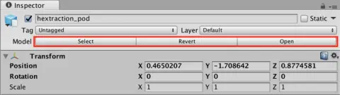 在层次结构中选择hextraction_pod。 在Inspector窗口中,您将看到三个按钮:Select,Revert和Open: