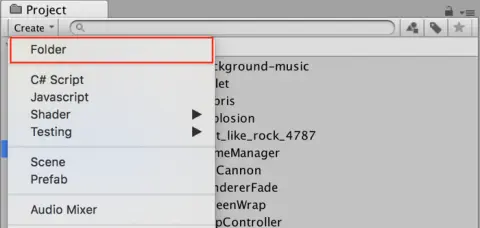 下一步是将资源整理到文件夹中。 在Project window中,单击Create按钮,然后从选项列表中选择Folder: