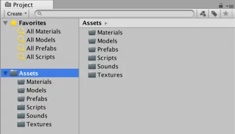 Unity中的文件夹与您计算机上的文件夹非常相似。 您可以创建子文件夹并将文件夹拖入和拖出其他文件夹。 底层文件系统将与Unity中的组织相匹配,这使您可以轻松地在Unity之外找到您的资源。